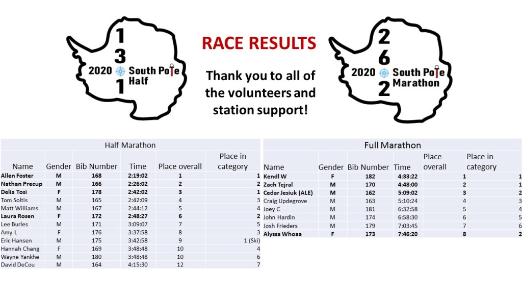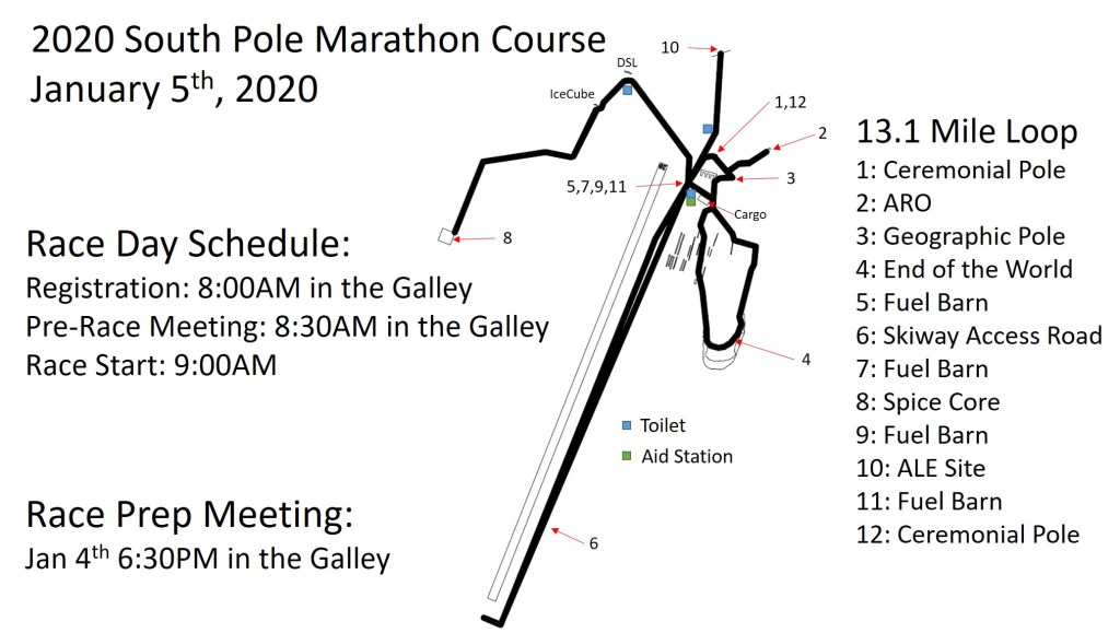 Today is the annual South Pole marathon. Each year, a running enthusiast volunteers to put on the event, usually the first Sunday in January when the weather is warmest, and there are no scheduled flights. This year, one of the winter-overs, Zach, took charge. Through the efforts of him and then many, many volunteers, this marathon stood out as a really wonderful and well put-together event!