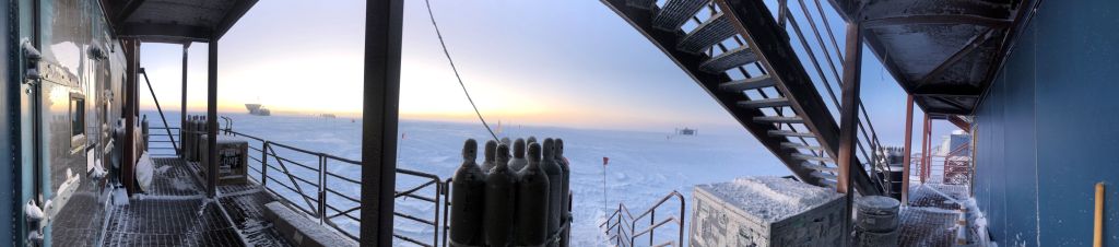 It is definitely getting dark. There is still some sunlight refracting enough through the atmosphere to get here, but my phone isn’t quite capable of showing that. In the panorama above, you can see the Moon, and the red lights from MAPO, the Station and the Ice Cube Lab (ICL) in order from left to right… but that’s it.